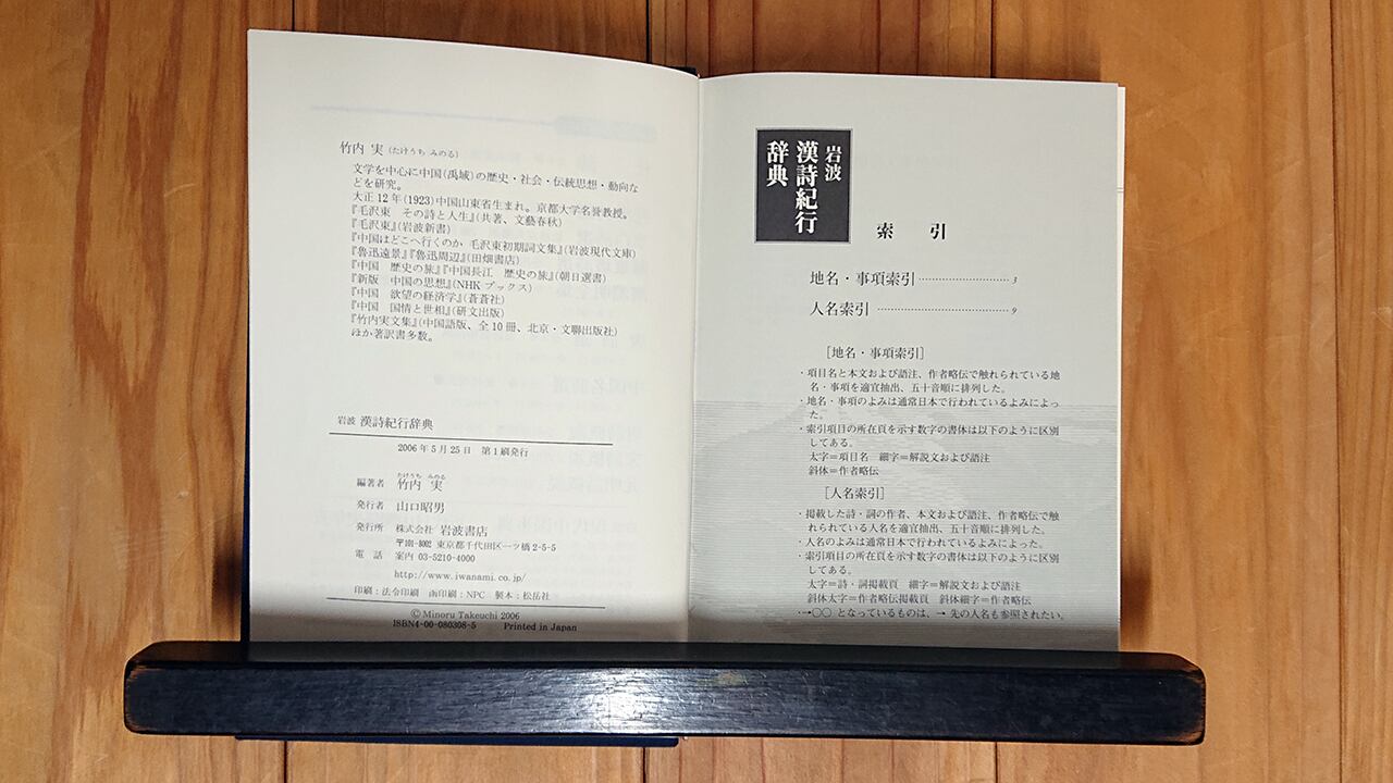 「本文」の前に「作者別掲載詩一覧」「表題・名句一覧」、後に「作者略伝」「用語解説」「人名索引」「地名・事項索引」を付すなど、編集者の「辞典」への熱意が伝わってくる。が、そのあまり、読者が容易には漢詩自体の魅力に到達し得ないもどかしさも禁じ得ない。とくに地図が一葉あるのみなのは残念であるものの、基礎から漢詩を学ぼうとする者には必携の書である。